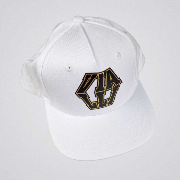 Make a bold statement with the Vialli White Snapback Cap, featuring a striking gold “Vialli” logo set within a sleek