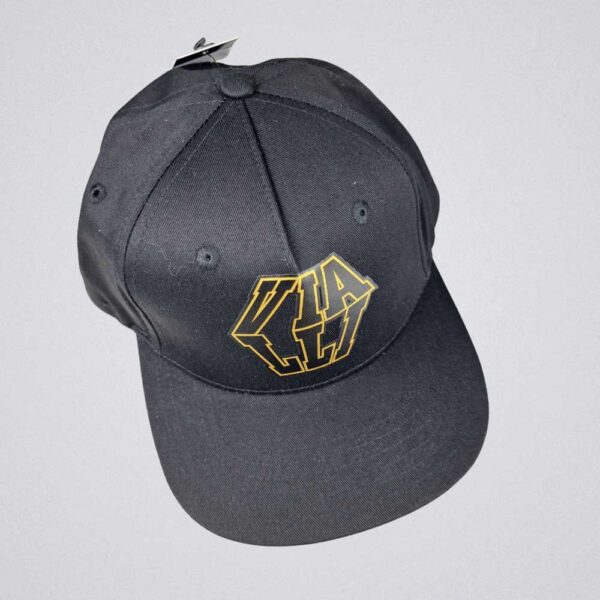 Top off your look with this sleek black Vialli snapback cap, featuring the brand’s name embossed in gold within a