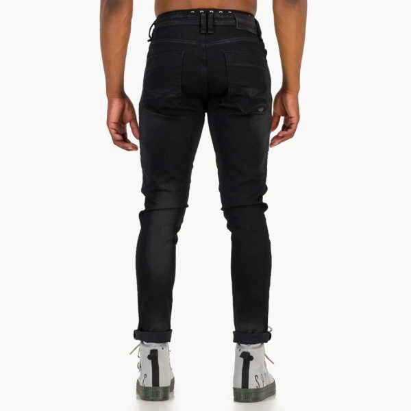 Straight around the hip, tapers towards the ankle, elasticated finish
