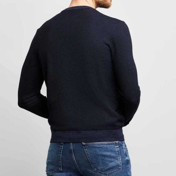 A classic knitted men's jumper from Bugatti with a crew neck that fits snugly under a jacket. The soft wool blend feels pleasantly warm against the skin. Two-tone jumper with a crew neck and a structured pattern. Composition: 50% wool, 50% acrylic.